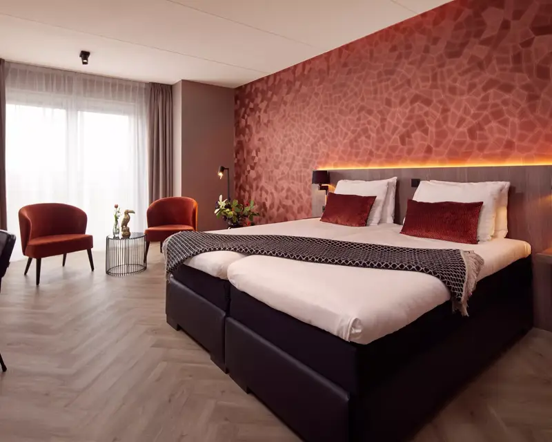 De Deluxe kamer van Van der Valk Hotel Texel – De Koog is 45 vierkante meter groot en is een van de ruimste kamertypes van het hotel.