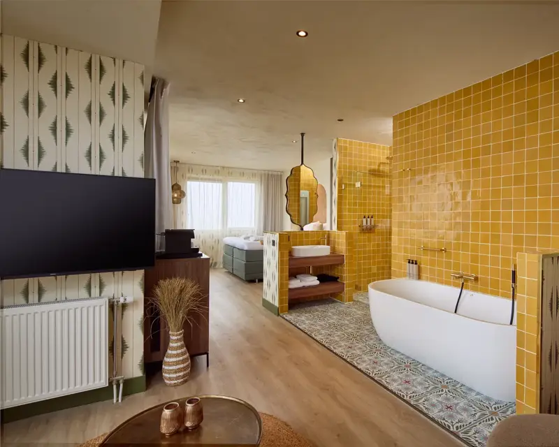 Laat je meevoeren naar warme sferen en oosterse elegantie. Deze ruime suite met kingsize bed en balkon biedt alles voor een luxe en ontspannen verblijf bij Van der Valk Hotel Texel De Koog.