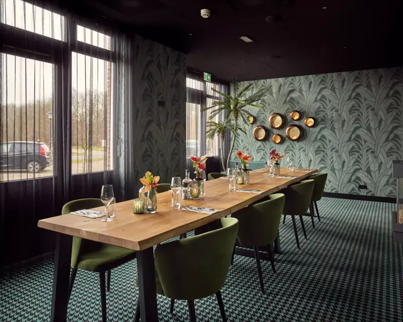 De Veurkamer is onze enige boardroom zaal en bevindt zich aan de voorkant van het hotel, naast het terras. Deze ruimte van 32 vierkante meter groot is geschikt voor maximaal 12 personen in een blokopstelling. De Veurkamer is niet alleen ideaal voor vergaderingen of kleine trainingen, maar ook uitermate geschikt voor een besloten diner of (afscheids)receptie.